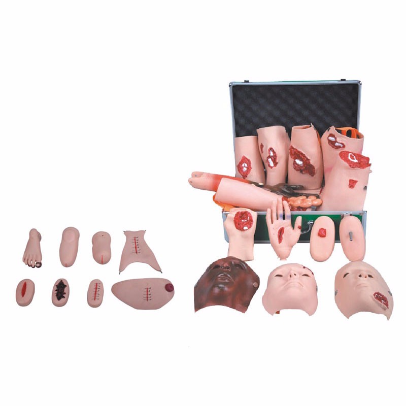 該創(chuàng)傷功能模塊呈現(xiàn)了極為豐富且逼真的創(chuàng)傷場(chǎng)景。涵蓋面部、肢體各處,面部有不同程度燒傷、撕裂傷與頜骨創(chuàng)傷;軀干部位存在鎖骨骨折、胸膛挫傷及腹部創(chuàng)傷伴小腸外露;四肢更是多樣,肱骨、股骨、脛骨開放性骨折,槍彈傷、異物刺傷、截肢傷口等應(yīng)有盡有,還有切開縫合傷口、皮膚裂傷、感染性潰瘍等,為創(chuàng)傷救治培訓(xùn)提供全方位模擬。