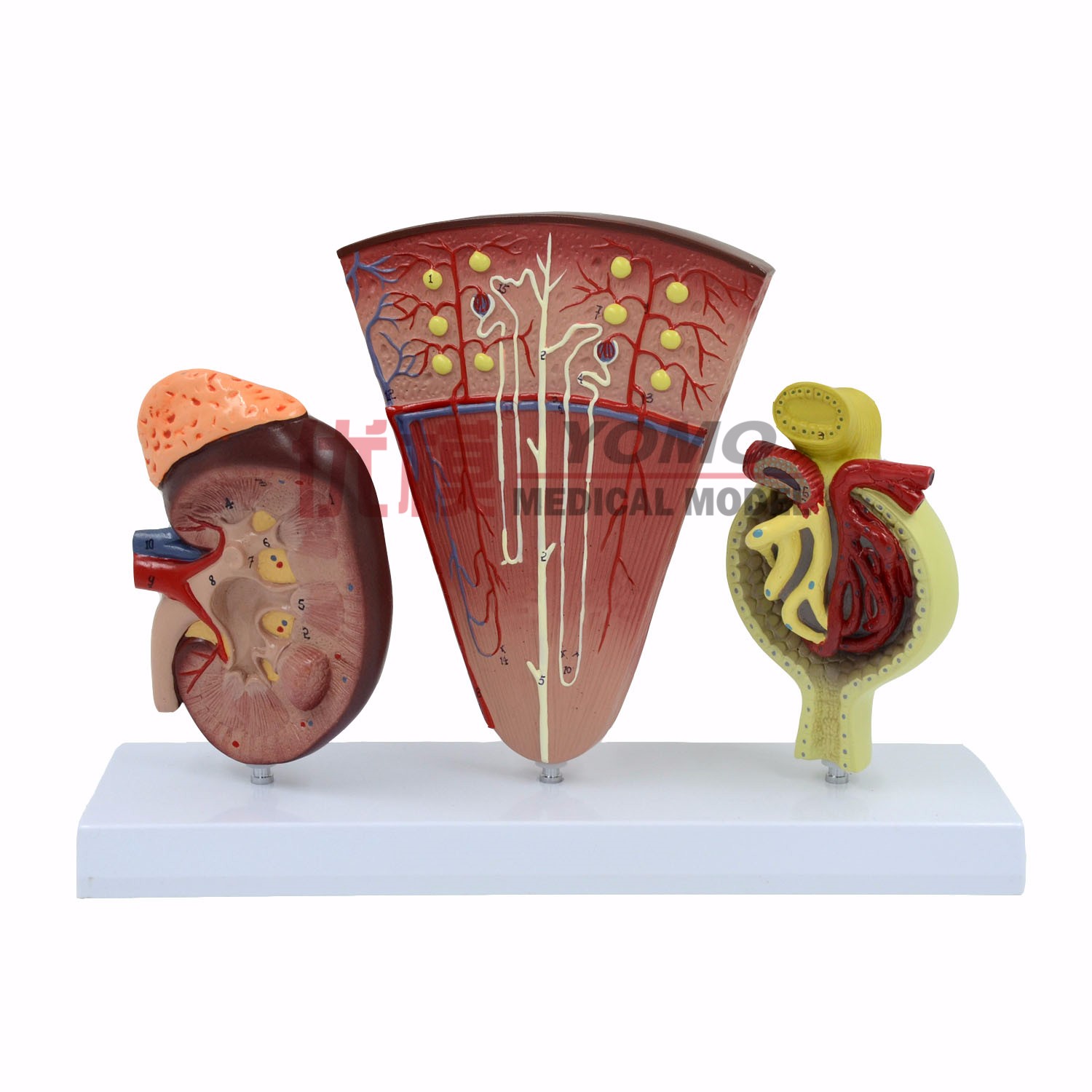 此款模型由腎剖面、腎單位和腎小球等3個(gè)放大模型組成,顯示腎剖面結(jié)構(gòu)(腎皮質(zhì)、腎髓質(zhì)、近端小管、遠(yuǎn)端小管、髓袢、集合管、乳頭管、腎小盞、腎大盞、腎盂、輸尿管)