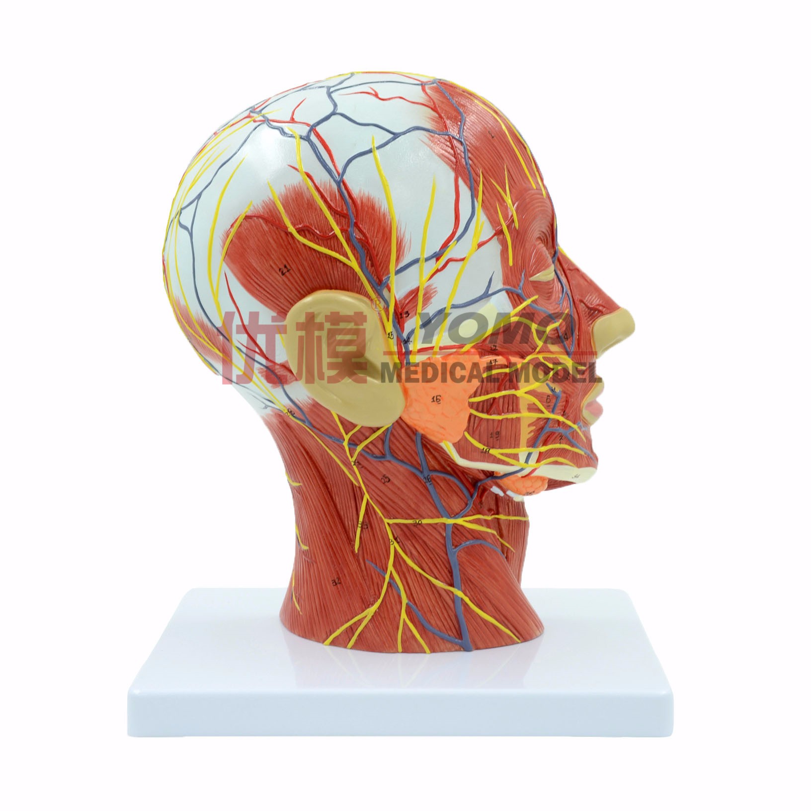 此模型為自然大頭頸淺表神經(jīng)血管肌肉模型,1部件,顯示了人類右側(cè)頭頸部及正中矢切面的細(xì)節(jié),包括暴露的臉部的淺表肌肉,臉部和頭皮的淺表血管、神經(jīng)及腮腺和上呼吸道的內(nèi)側(cè)結(jié)構(gòu)及頸椎矢狀斷面結(jié)構(gòu)。