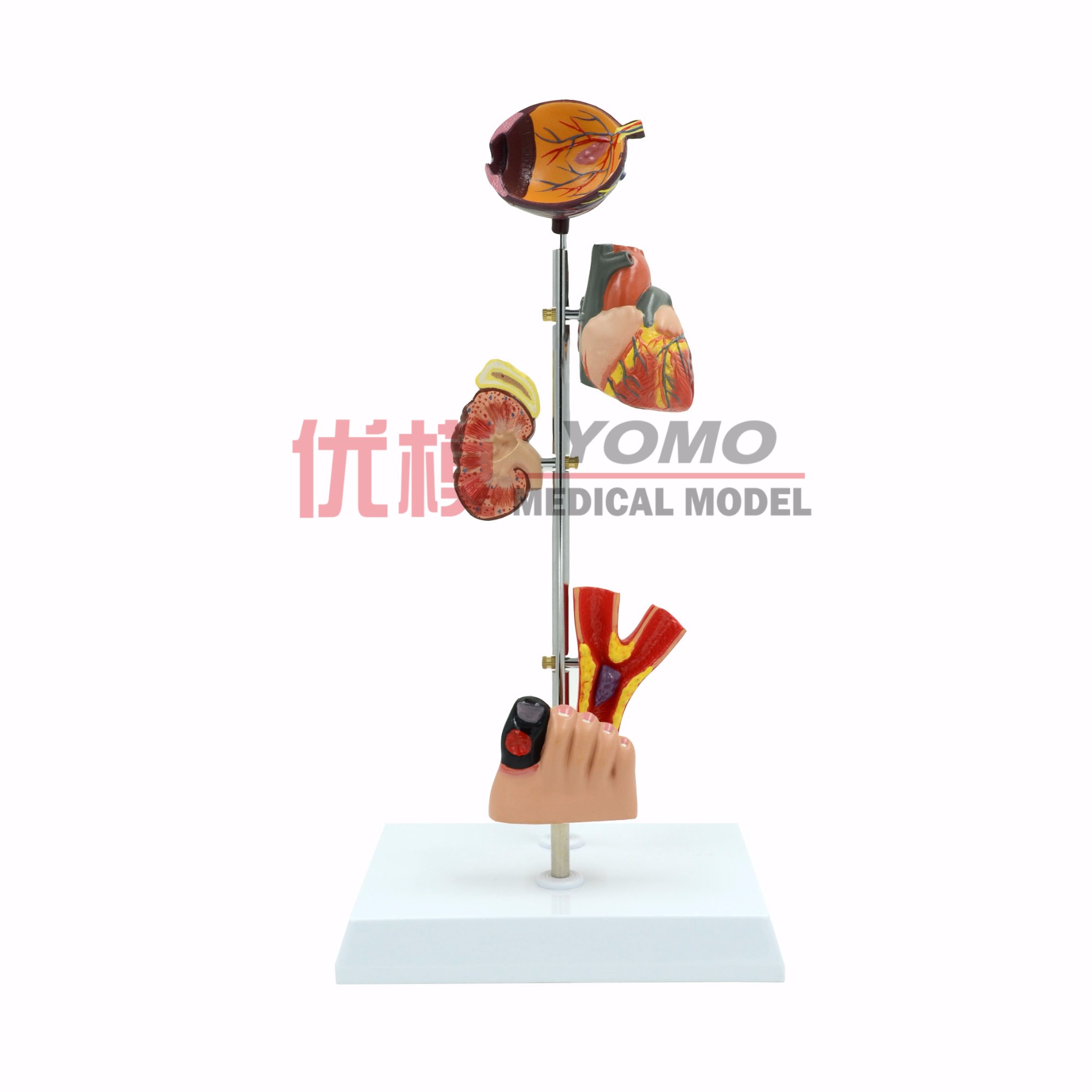 此款模型展示了可能的糖尿bing在人體組織器官的顯示狀態(tài),糖尿bing性壞疽,血栓,糖尿bing性眼底動(dòng)脈病變,糖尿bing性心臟bing等。