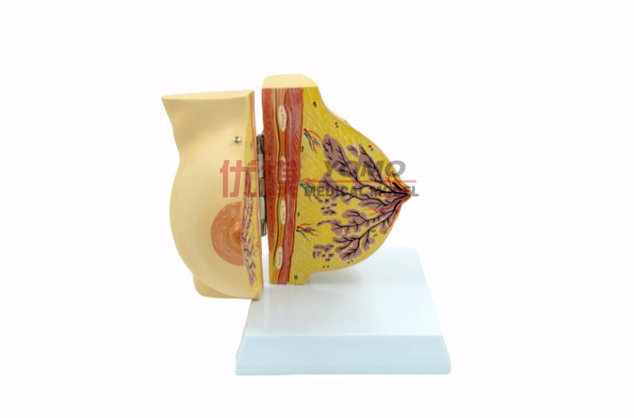 此款模型由兩個部件組成,可活動打開,顯示靜止期女性乳房剖面結(jié)構(gòu),共有12個部位指示標(biāo)志。