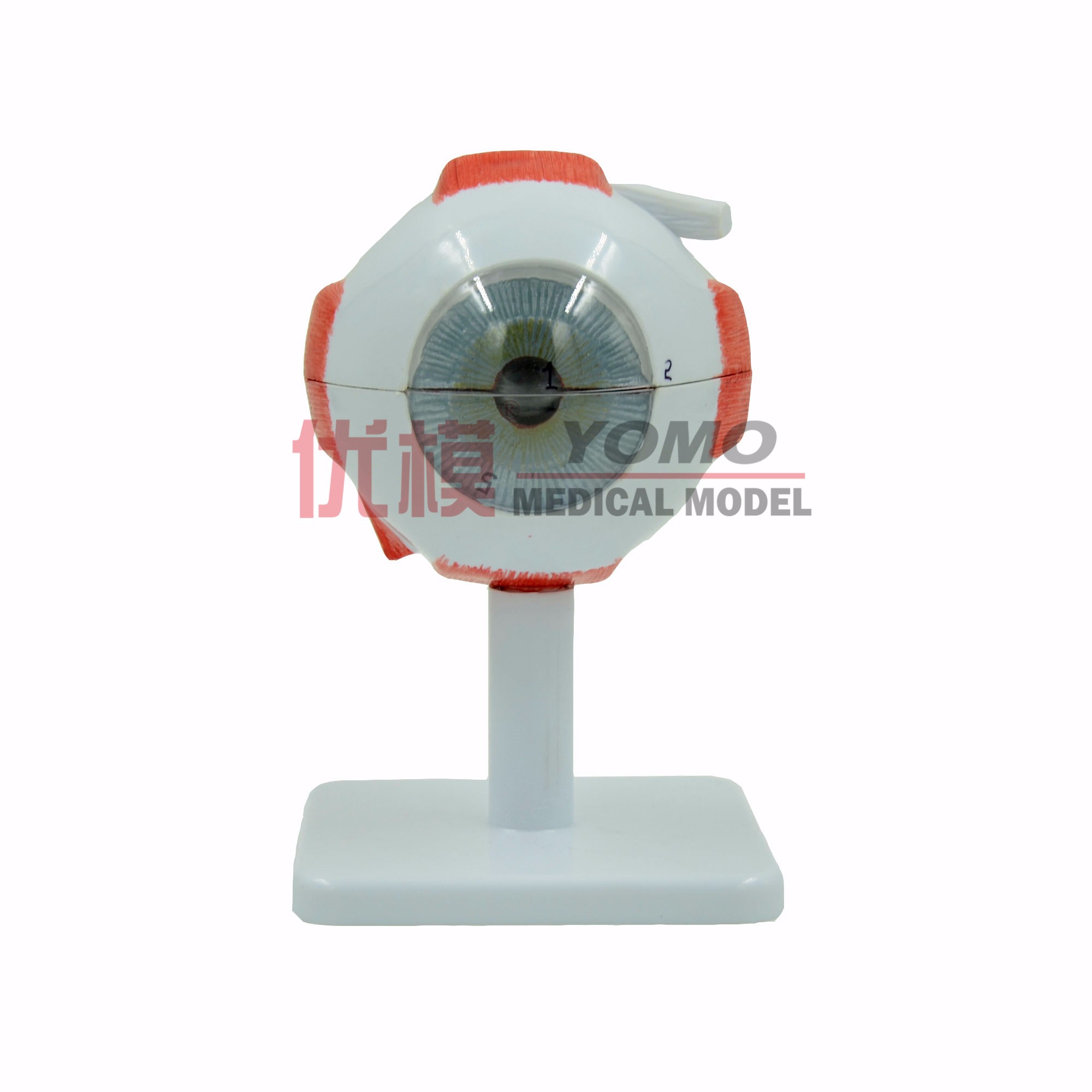 此模型為眼球模型,3倍大,6部件,此眼球模型正中矢狀切,出示了眼球詳細的內(nèi)部結(jié)構(gòu)。角膜,虹膜,晶狀體,玻璃體可自由拆裝,其中鞏膜上的肌肉附著和部分脈絡(luò)膜也可以觀察到。