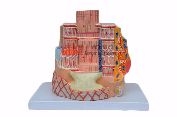 該模型放大40000倍,1部件,顯示骨骼肌纖維部分剖面和運(yùn)動(dòng)終板在電子顯微鏡下的放大結(jié)構(gòu),可觀察骨骼肌纖維肌內(nèi)膜、成纖維細(xì)胞核、肌細(xì)胞核、肌絲、肌原纖維、神經(jīng)元軸突、軸突失去髓鞘、運(yùn)動(dòng)終板突觸剖面、突觸前膜、突觸后膜、線粒體等結(jié)構(gòu),共有19個(gè)部位指示標(biāo)志。