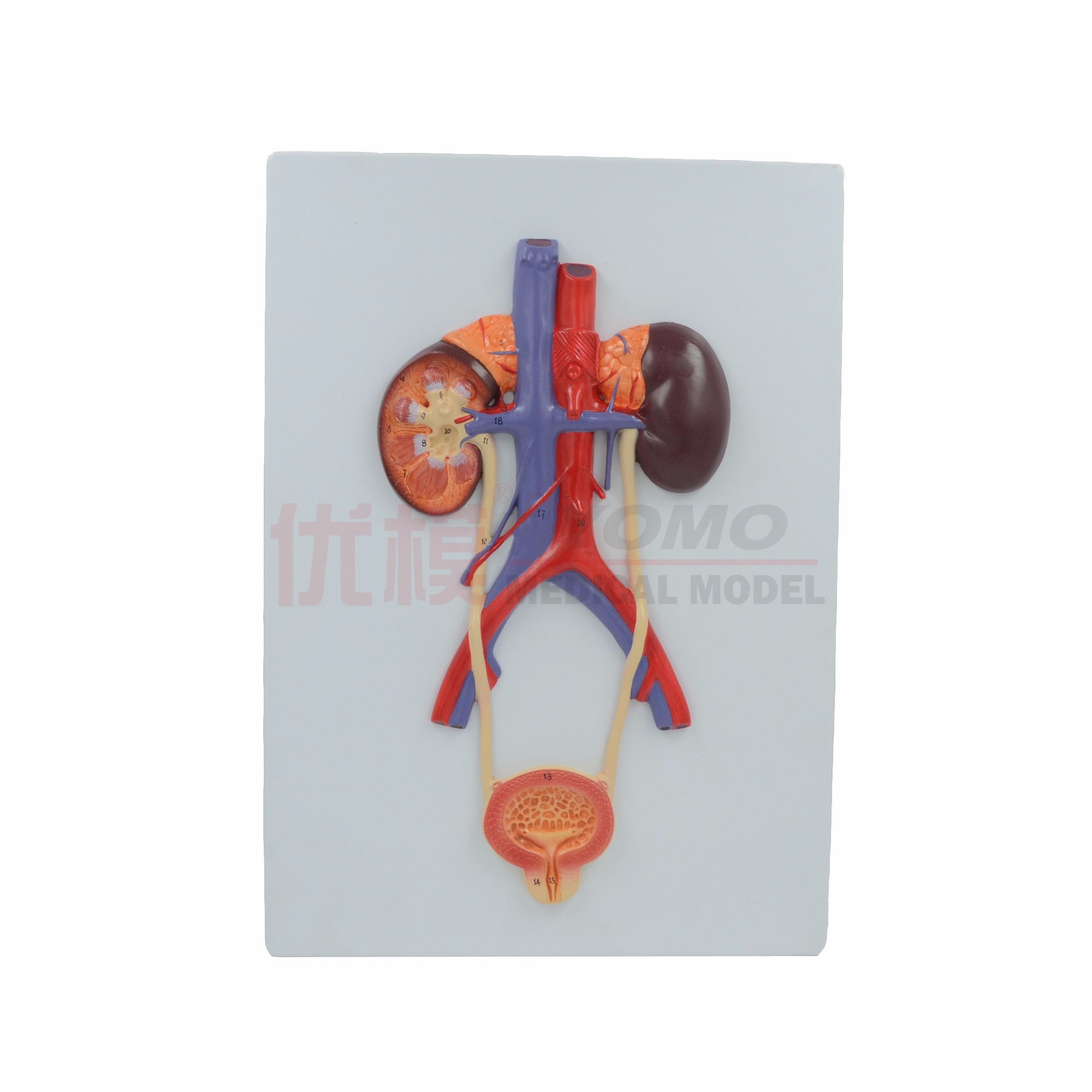 此款模型顯示泌尿系統(tǒng)及各器官,腎臟、輸尿管、膀胱、尿道。浮雕模型。由優(yōu)質(zhì)塑料制成,裝于一底板上。