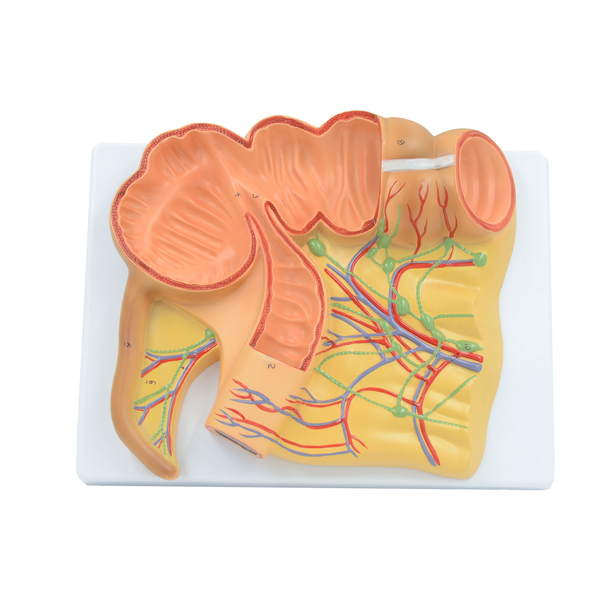 此款模型顯示了回腸末端,回腸瓣,盲腸,闌尾,升結(jié)腸始段結(jié)構(gòu)及其淋巴結(jié)分布。