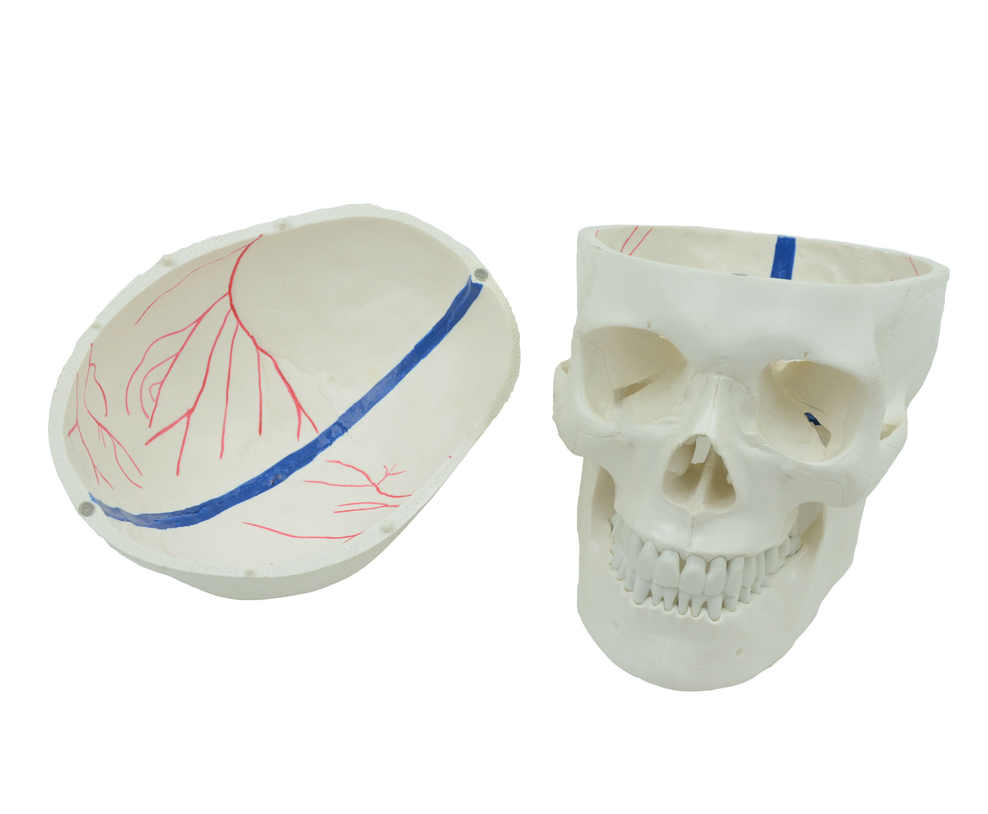 此款1比1大小的頭骨模型精確展示了正常人類頭骨的解剖細節(jié),并在顱內展示了血管,并附有數(shù)字標識,方便教學。