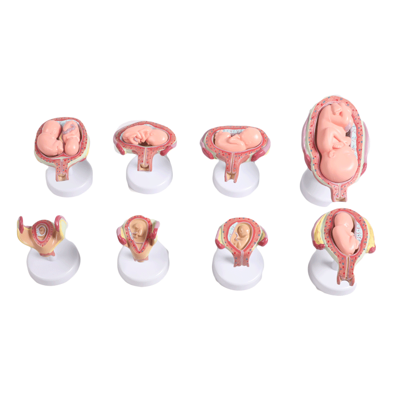該模型由妊娠胚胎發(fā)育過程一、二、三、四、五、六、七個(gè)月胚胎和五個(gè)月雙胞胎等8個(gè)模型組成。其中四、五、六、七個(gè)月胚胎和五個(gè)月雙胞胎模型胎兒可以取出,并顯示子宮、陰道、胎兒、臍帶、胎盤、羊膜腔以及卵巢、輸卵管等結(jié)構(gòu),每個(gè)模型均有結(jié)構(gòu)指示標(biāo)志。