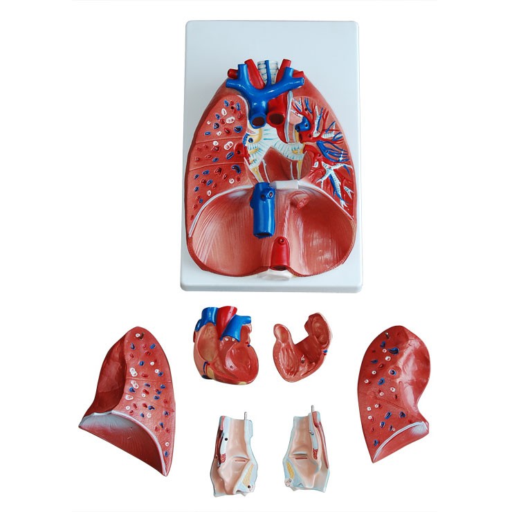 該模型自然大小,分成7件。兩瓣肺葉可取下示其內(nèi)部結(jié)構(gòu)。心臟縱剖示心房、心室和瓣膜。喉頭也分成兩件。