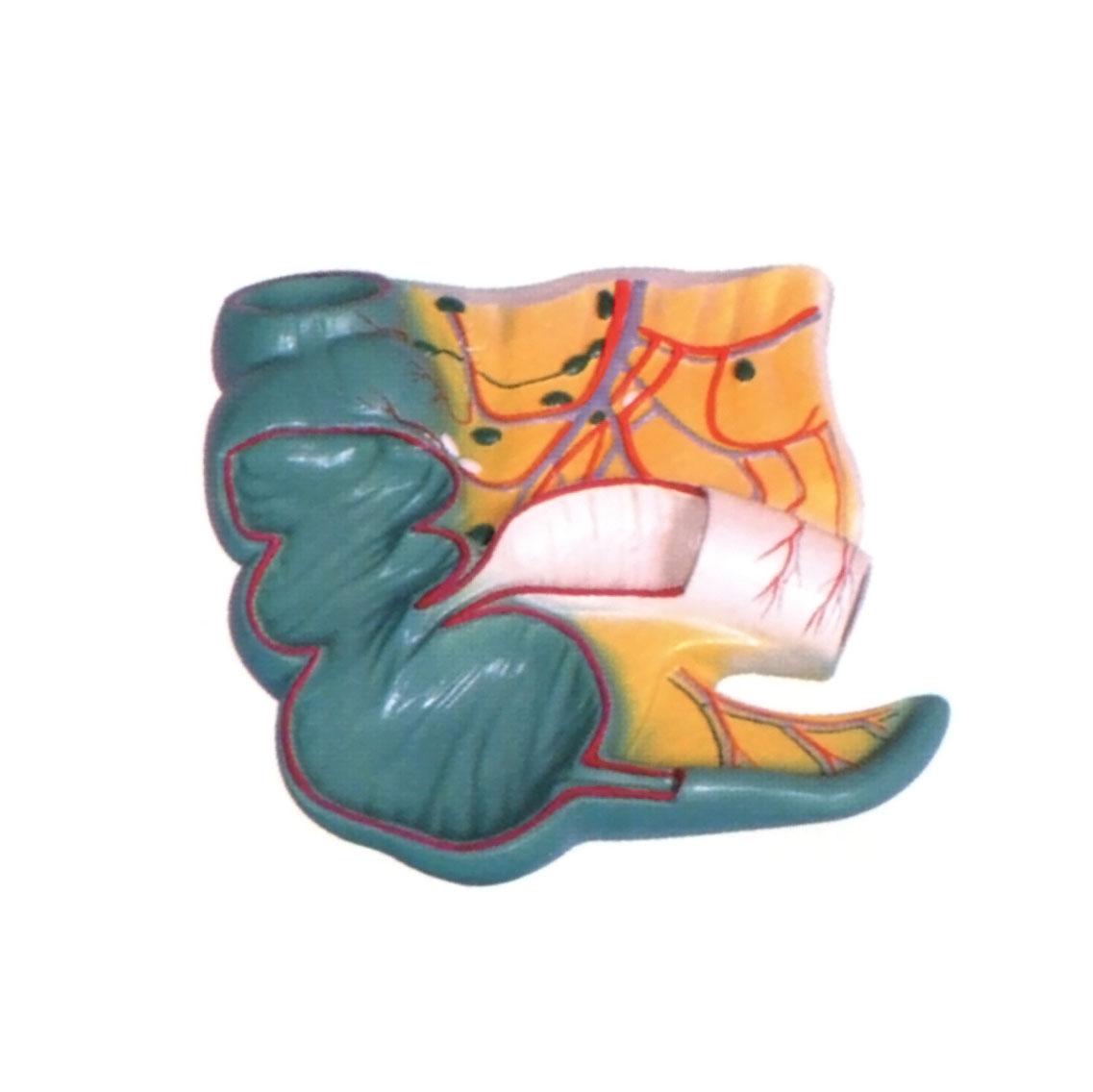 博友BM1078闌尾和盲腸模型的直腸作剖面,示結(jié)腸袋,結(jié)腸半月襞,示回盲口、回盲瓣、回盲系膜、示回腸、盲腸、回盲下隱窩、示闌尾、闌尾口、闌尾系膜。