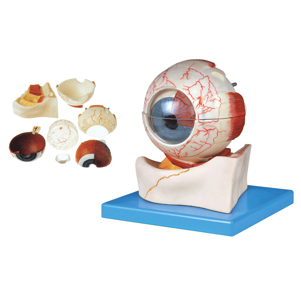 博友BM1192眼球構(gòu)造放大模型 該模型在上頜骨上方將眼球水平切,由眼球壁鞏膜、脈絡(luò)膜上、下半側(cè)、角膜、晶狀體和玻璃體等7個(gè)部件組成,并顯示眼球壁鞏膜、角膜、虹膜、睫狀體、脈絡(luò)膜和視網(wǎng)膜的構(gòu)造以及眼球內(nèi)容物、眼球外肌、血管和神經(jīng)等結(jié)構(gòu),共有31個(gè)部位指示標(biāo)志。