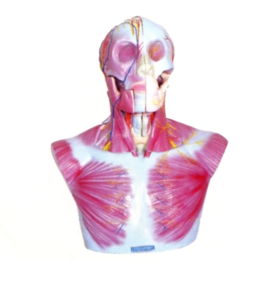 模型的頭頸部作正中矢狀切,示各器官的結構,左半側腦可拆下示腦N外形及進出腦顱底的部位;在顯示頭頸部肌肉的基礎上示深淺血管和神經的走向分布。
