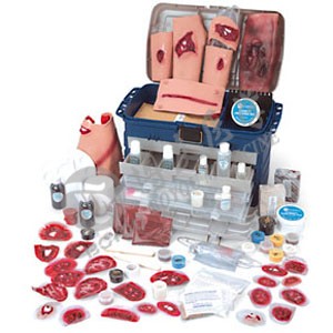 該套模型包括7套流血性傷口,15種創(chuàng)傷粘貼件,可組合70多種創(chuàng)傷情景